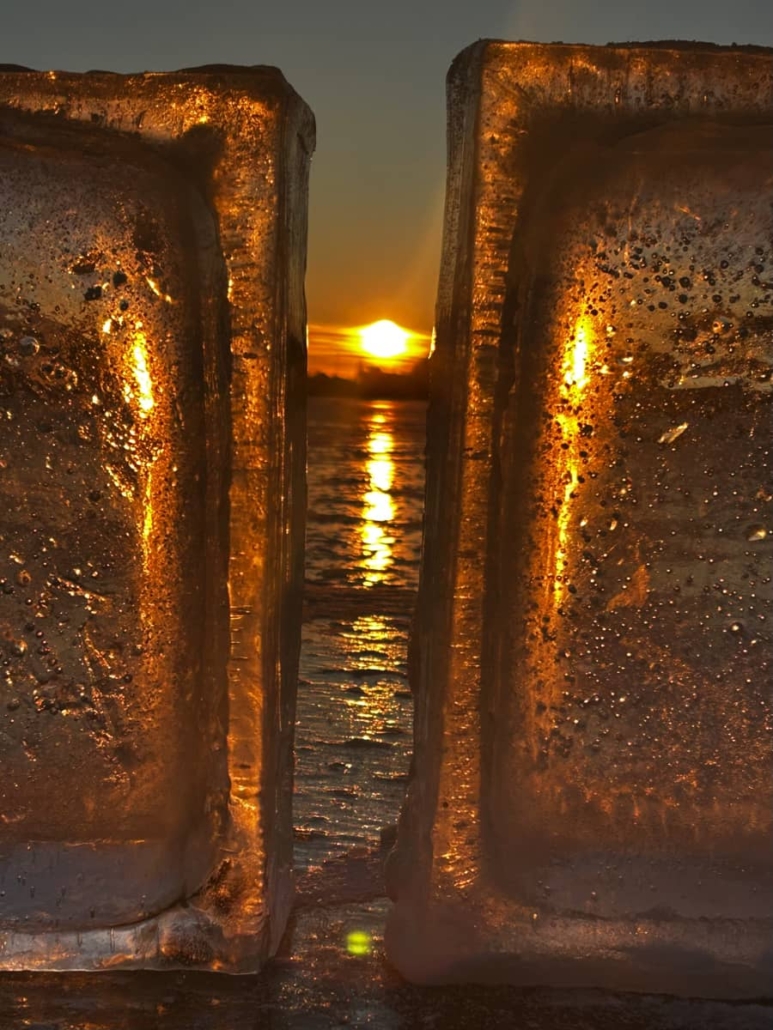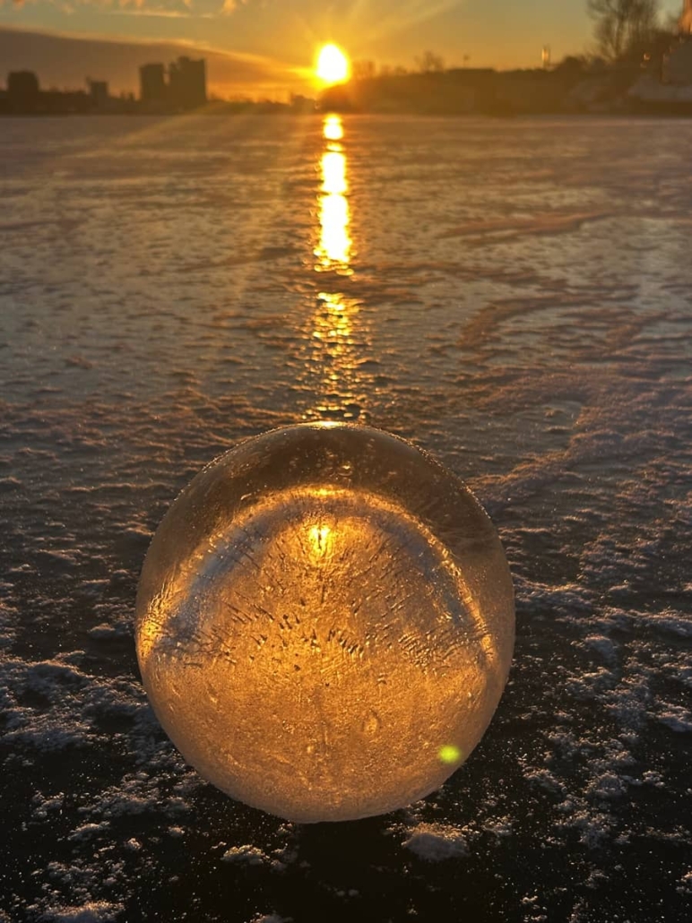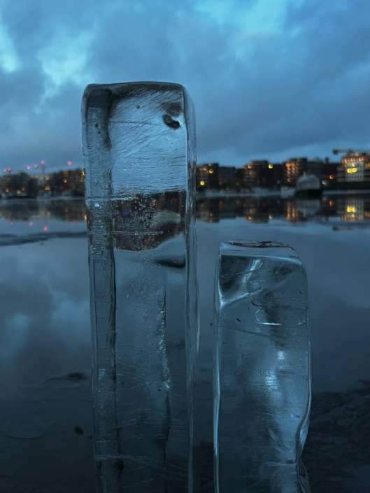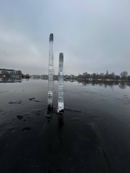 fotografien einer temporären installation mit kugeln und quadern aus eis auf dem rummelsburger see